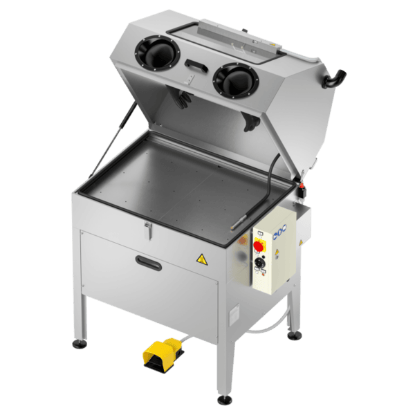 Dimensions plan de travail L 950 x l 700 (mm) L’efficacité du lavage est garantie par une pompe haute pression et par une buse de pulvérisation spéciale.Par cette configuration, la machine est alimentée exclusivement par l’air comprimé pour l’utilisation de détergents à utiliser à la température ambiante. Caractéristiques techniques • Pression réglable de 0 à 80 bar• Fermeture porte assistée avec ressort à gaz et crochet de fermeture• Gants en latex noir longueur (anti-huile et anti-graisse, bonne résistance mécanique et aux produits chimiques)• Joint de bordure cuve• Structure et tôle en contact avec le liquide en acier INOX Aisi 304• Lance de lavage spéciale avec jet en pression et poignée antidérapante• Fin de course de sécurité sur l’ouverture du couvercle• Actionnement du lavage par pédale• Pieds réglables• Porte de fermeture avec gants et verre trempé• Pistolet de soufflage à air comprimé• Pression de lavage réglable manuellement• Blanchissage des soudures internes• Tuyauteries d’aspiration et de refoulement pompe flexibles(entretien simplifié)• Pinceau de lavage spéciale ergonomique• Vannes de déchargement pour vidange réservoirs• Vanne manuel pour vidange du liquide de surface (huile entier) Elle existe aussi en version L et XXL.