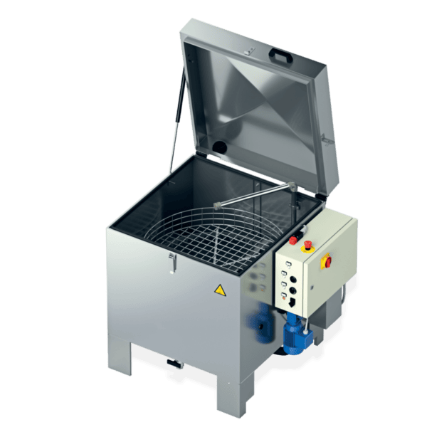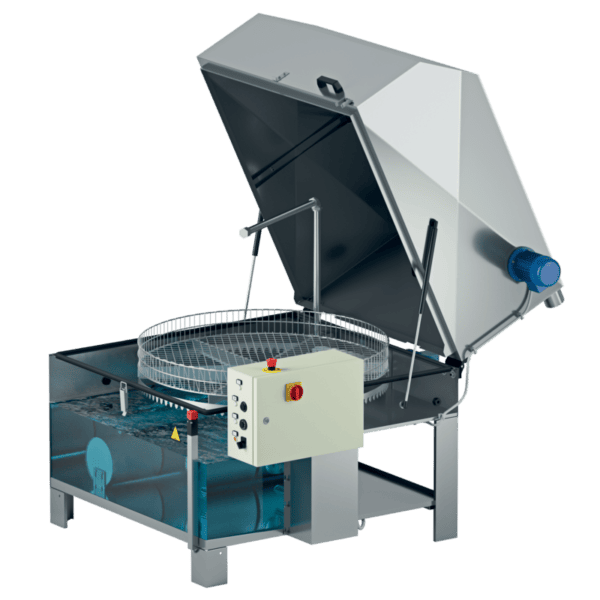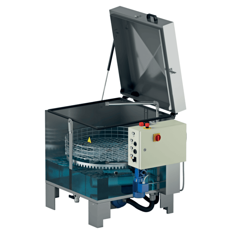 Il s’agit d’une machine qui permet le lavage automatique de pièces mécaniques de moyennes dimensions.Le lavage est effectué grâce à l’action des jets supérieurs, inférieurs et latéraux. Le panier tourne grâce à un motoréducteur; le tableau est électromécanique. L’opérateur peut saisir la température du liquide du réservoir et la durée du traitement.